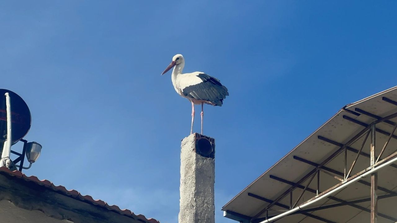 Adem Yılmaz'ın evinin bacasına ve çatısına konan leylek, Eskikaraağaç Mahallesi sakinlerini de heyecalandırdı.